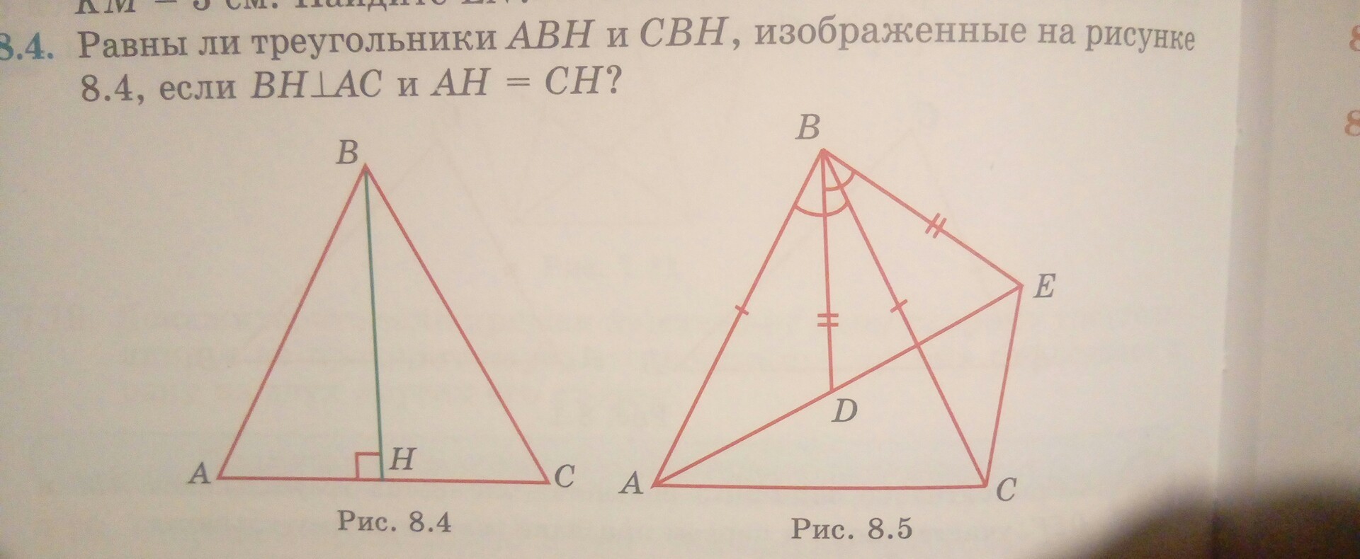 Равны ли треугольники АВН и СВН, изображенные на рисунке 8.4, если ВН ⊥ АС и АН = СН?