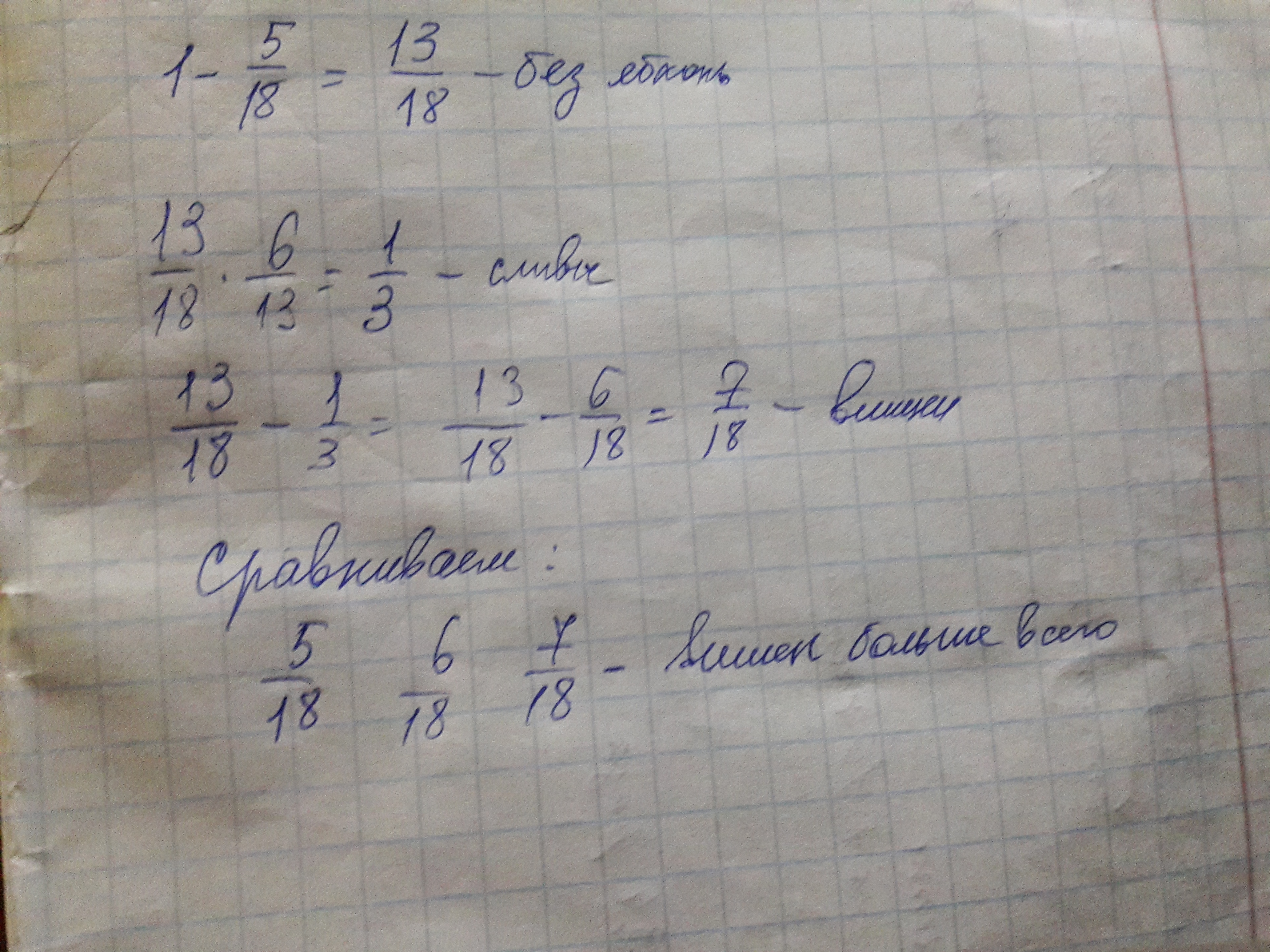 Яблони составляют 5/18 деревьев, которые растут в саду, сливы 6/13 от остатка, а вишни оставшаяся часть. Каких деревьев в саду больше?