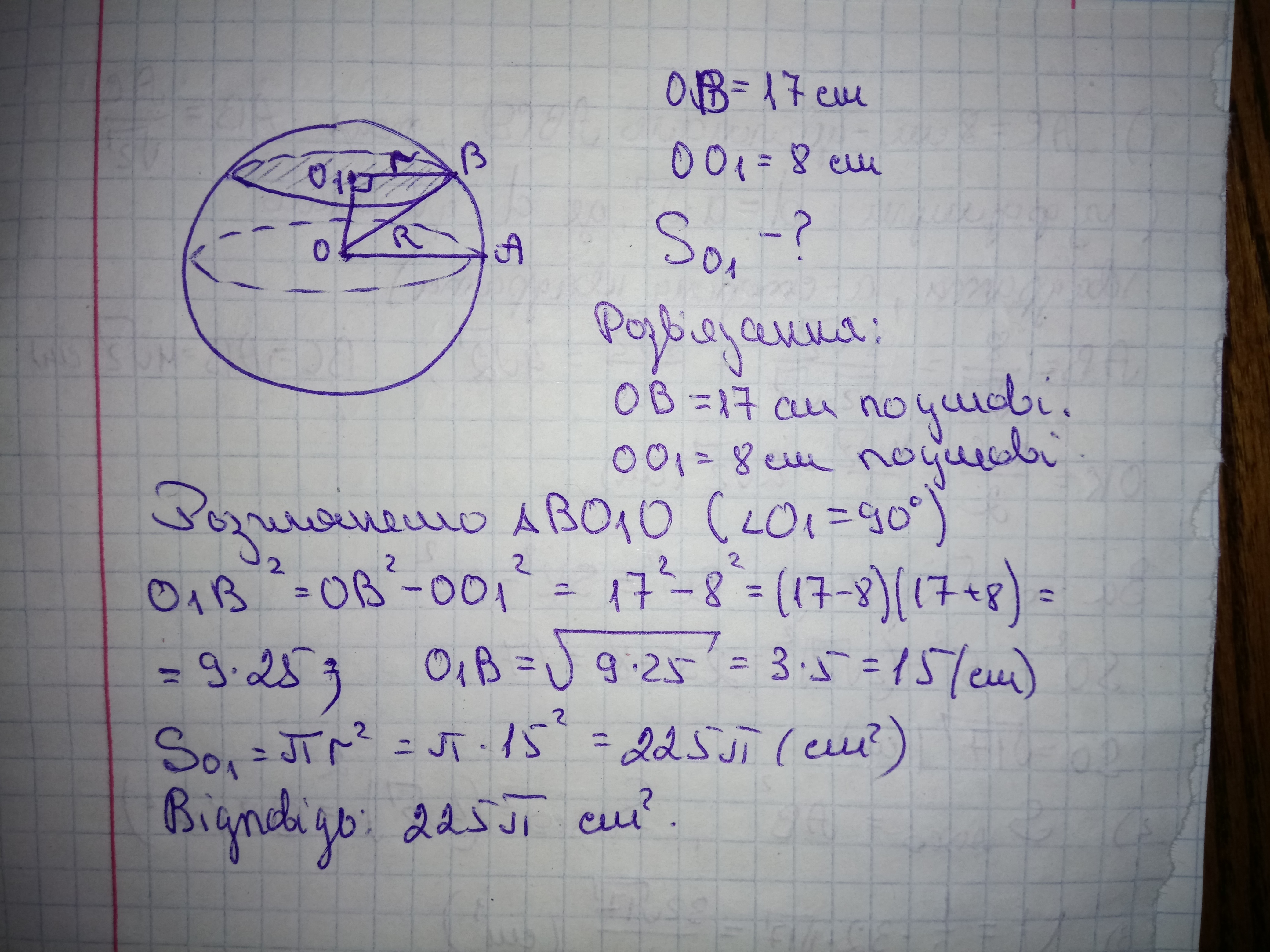 Кулю, радіусом 17 см, перетнуло площиною на відстані 8 см від її центру. Знайти площу перерізу кулі.