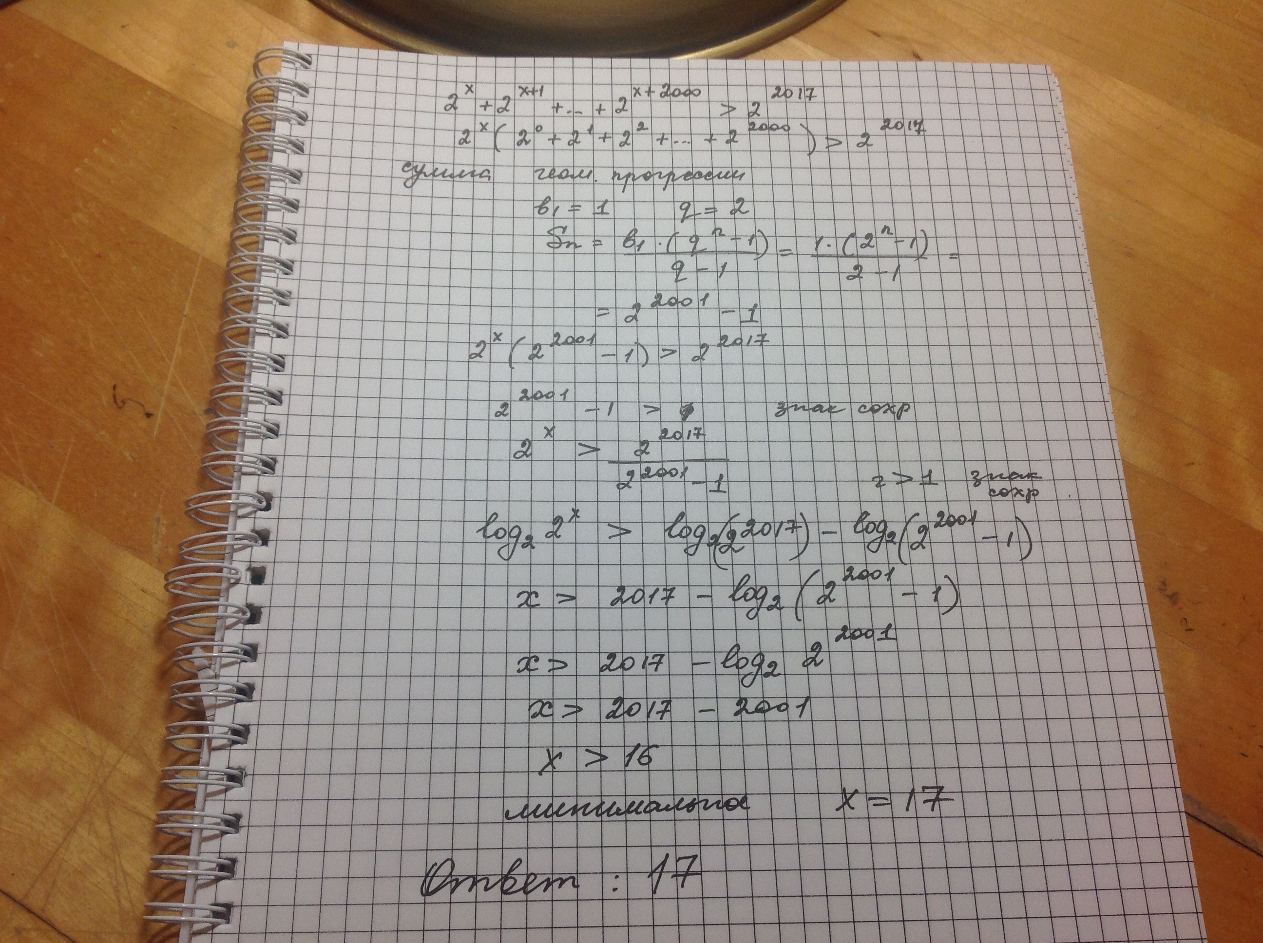 Найдите наименьшее натуральное решение неравенства 2x+2x+1+…+2x+2000>220172x+2x+1+…+2x+2000>22017.