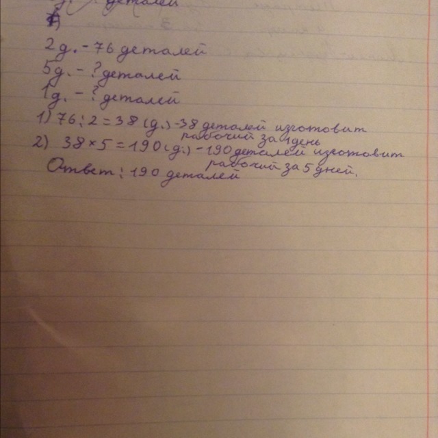 За два дня рабочий сделал 76 деталей. Сколько деталей он изготовит за пятидневную рабочую неделю при такой же производительности труда?