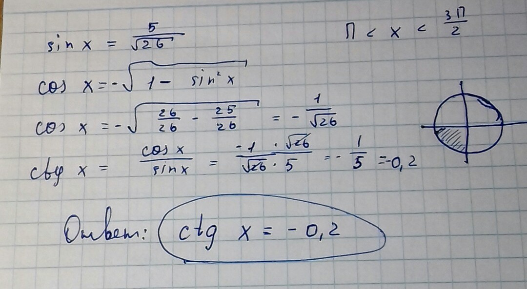 Насколько я знаю, в данной четверти синус и косинус отрицательны. Так и не понял, почему в условии дан положительный синус. Если он отрицательный, то решение такое, если я ошибся с четвертью, то знак будет другой