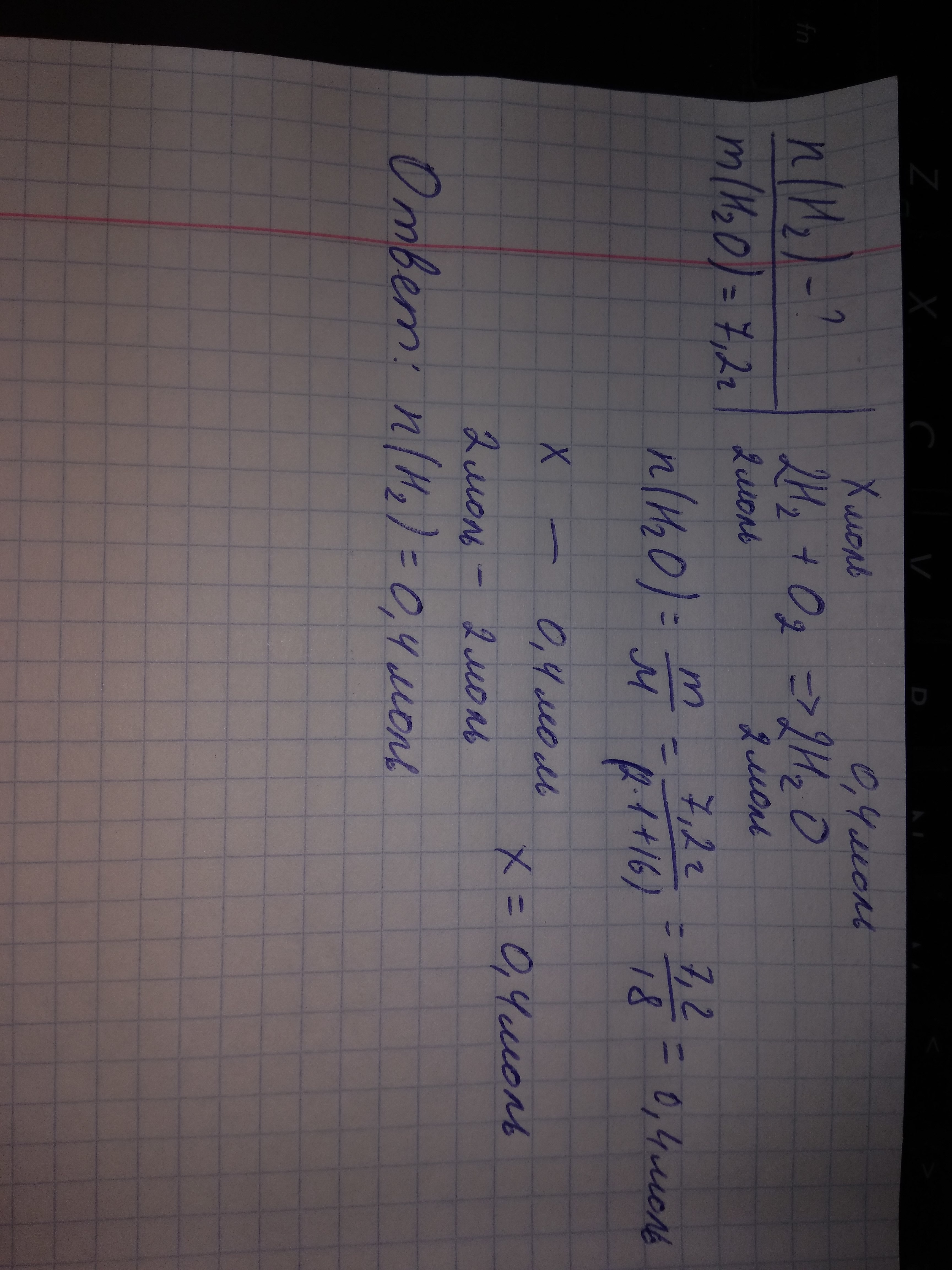 какое количество вещества водорода вступило в реакцию с кислородом,если при этом образовалось 7.2 г воды?