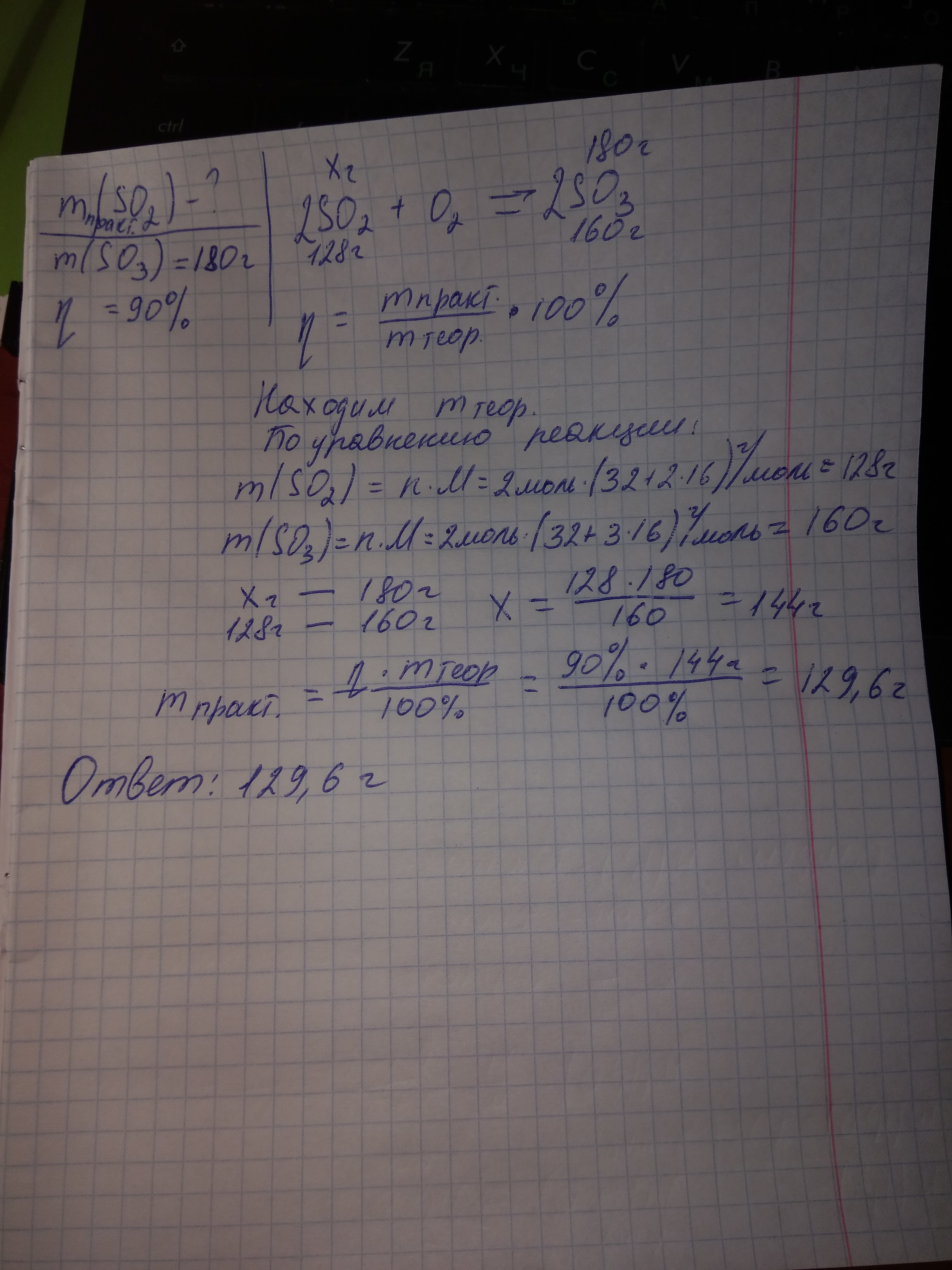 Вычислите массу оксида серы 4 валентного, который потребуется для получения 180 грамм оксида серы 6 валентного если выход продукта реакции состовляет 90% от теоретически возможного. ПОЖАЛУЙСТА С РЕШЕНИЕМ!!