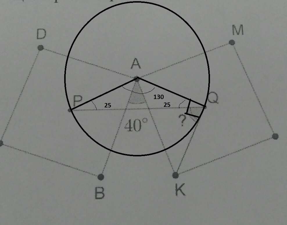 квадрат AKML получен поворотом квадрата ABCD вокруг точки A на угол 130 против часовой стрелки. Р - центр квадратаABCD. Q- квадрата AKML. найдите угол PQK