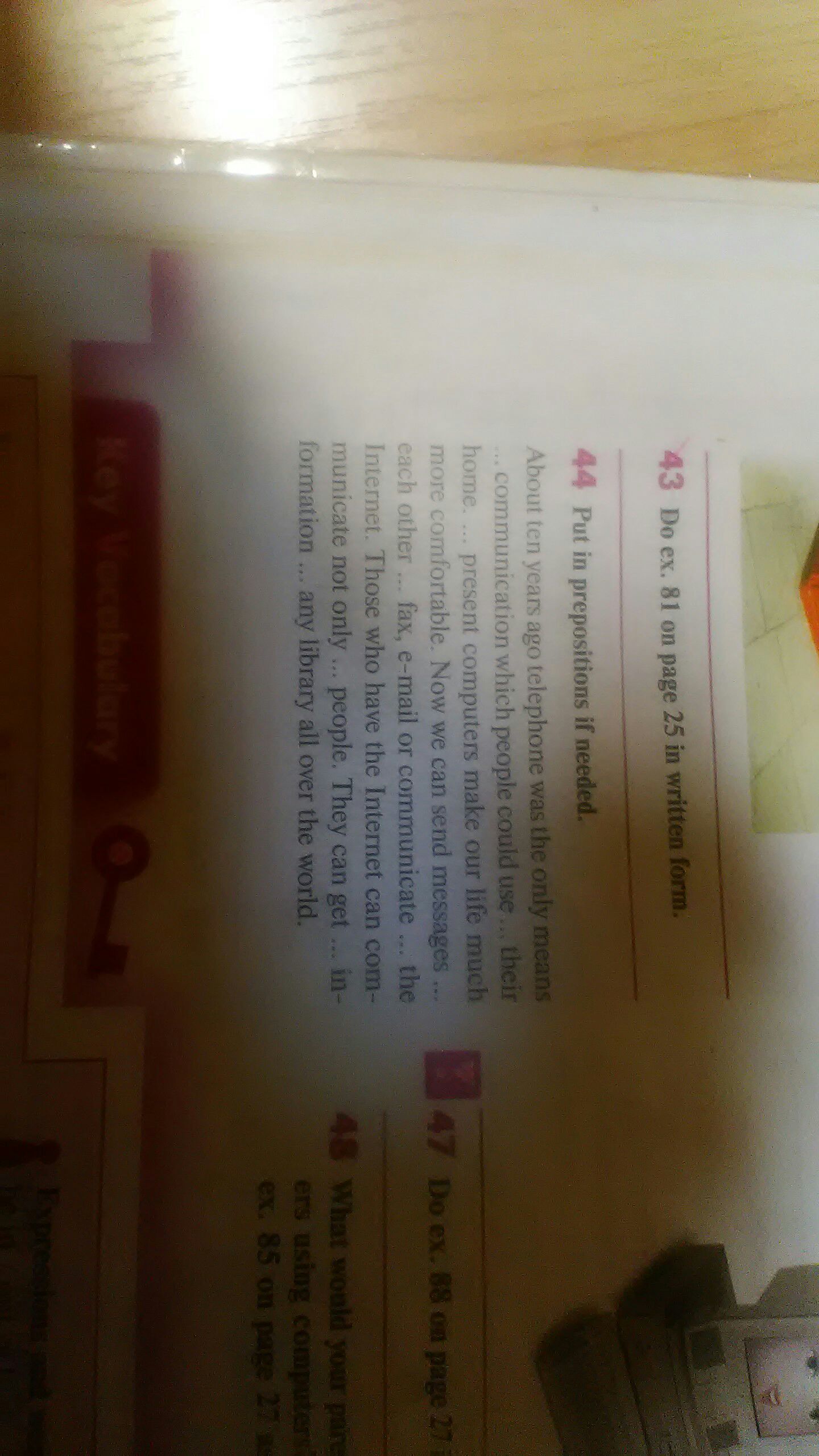 About ten years ago telephone was the only means of communication which people could use in their home. Present computers make our life much more comfortable. now we can send messages to each other by fax , e-mail or communicate in the Internet. Those who have the Internet can communicate not only with people. They can get information from any library all over the world.
