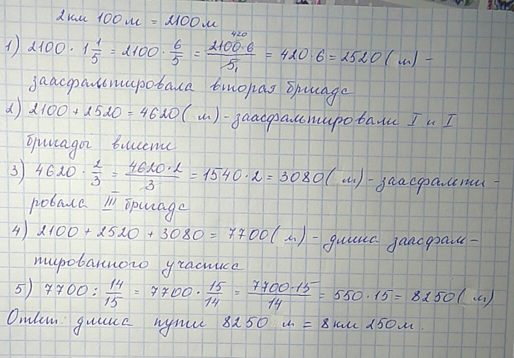 Первая бригада заасфальтировала 2 км 100 м шоссе, вторая в 1,1/5 раза больше чем первая а третья 2/3 того что сделали oбе первые бригады. Длина заасфальтированного участка составила 14/15 всей длины шоссе. Какова длина пути?
