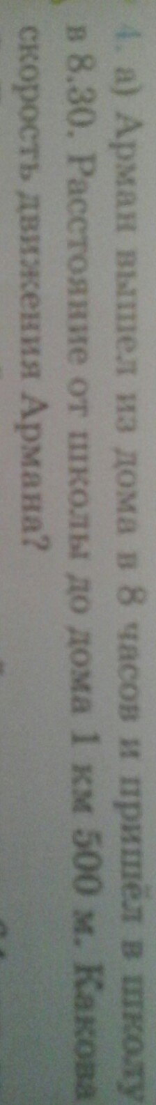 арман вышел из дома в 8:00 и пришёл в школу в 8:30 расстояние от школы до дома 1 км 500 м Какова скорость движения Армана