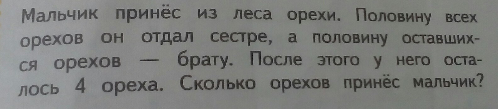 мальчик принёс орехи .половину отдал сестре а вторую половину брату .у него осталось 4 ореха сколько орехов принёс мальчик