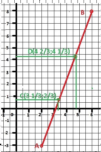 Отрезок между точками A(2; -3) и B(6; 8) точками C и D разделен на три равные части. Убедится, что Xc = 10/3, Yc=2/3 ; Xd=14/3 , Yd=13/3