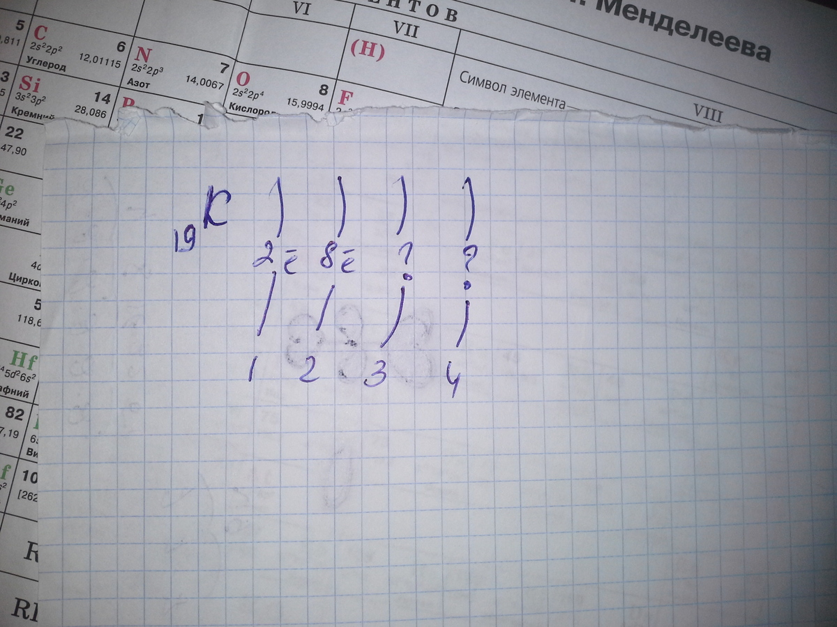 Помогите пожалуйста. Как вычислить количество электронов на предпоследнем уровне, если периодов больше чем распределение атомов, например, калий 19 порядковый номер, уровней должно быть 4, на первом 2, на втором 8, а вот как раз распределение последующих меня интересует. Объясните.