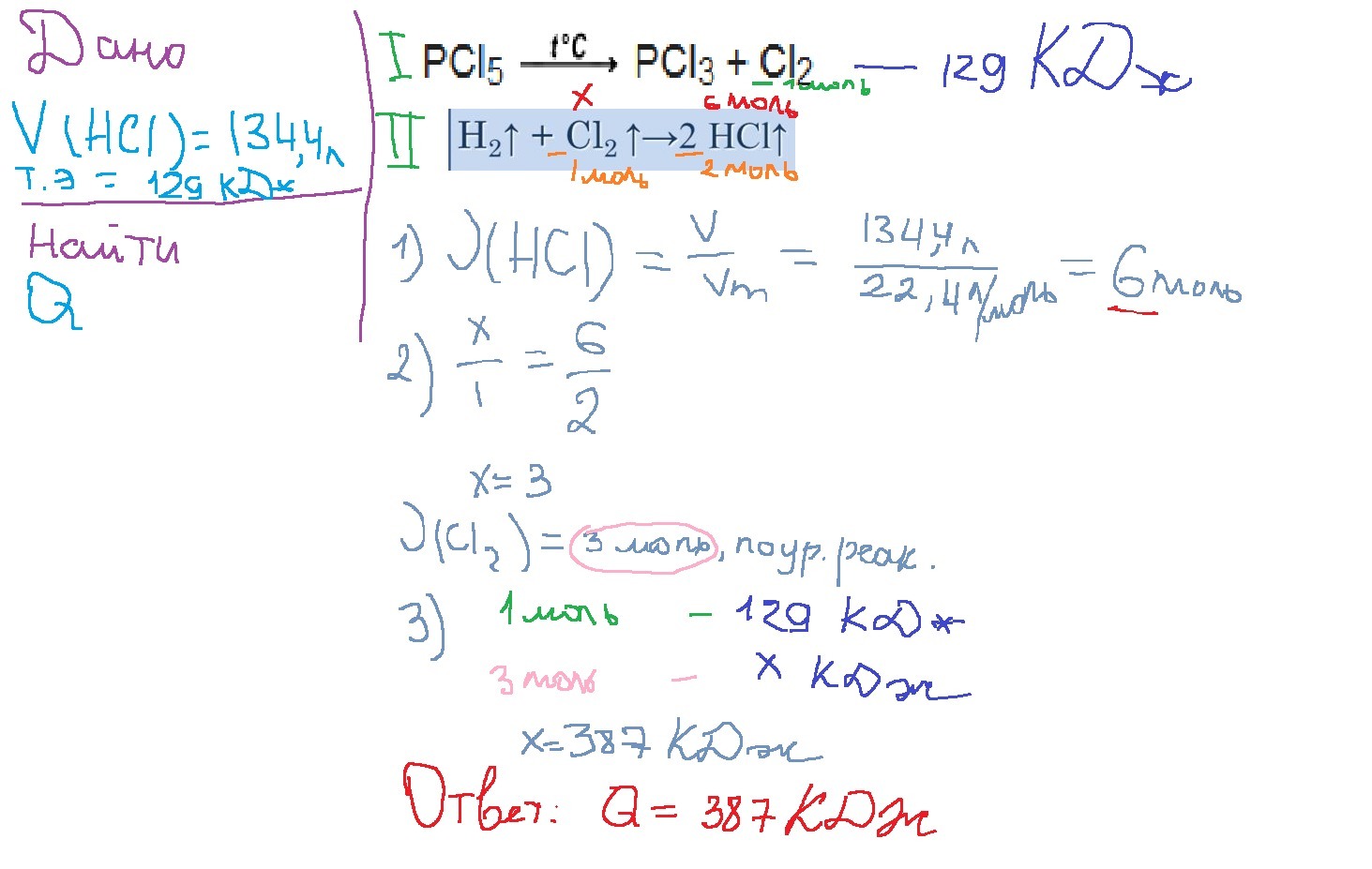 Какое количество тепла (в кДж) необходимо затратить при разложении хлорида фосфора (V) до хлорида фосфора (III), что бы из полученного хлора синтезировать 134,4 л хлороводорода (при н.у.) ? Тепловой эффект реакции разложения-129кДж.