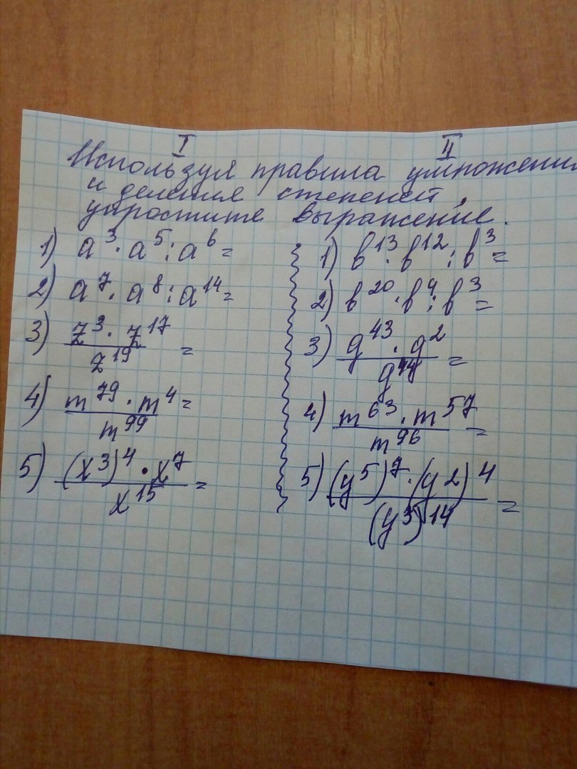 1).a^3*a^5:a^6=a^8:a^6=a^2; 2). a^7*a^8:a^14=a^15:a^14=a; 3).z^3*z^17/z^19=z^20/z^19=z; 4). m^79*m^4/m^99=m^83/m^99=m^-16; 5).(x^3)^4*x^7/x^15=x^12*x^7/x^15=x^19/x^15=x^4.