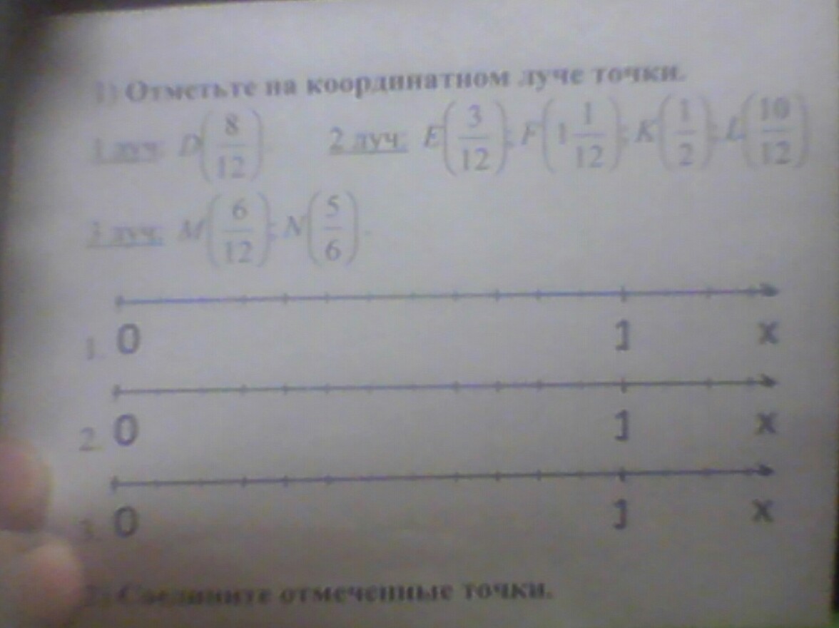 отметьте на координатном луче точки. D(8/12). E(3/12;F(1 1/12); K(1/2); L(10/12) M(6/12); N(5/6).
