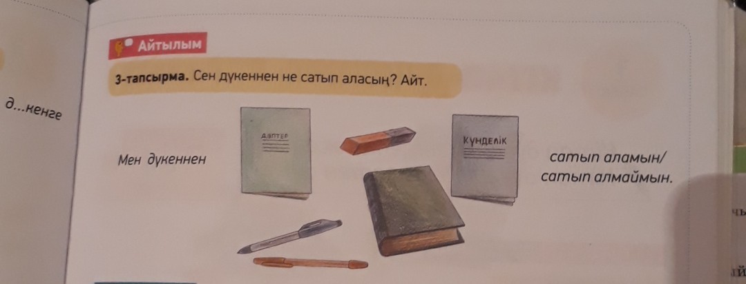 Мее дүкеннен дəптер, қалам жəне өшіргіш сатып аламын.Ал кітап сатып алмаймын. Себебі менің ұнататын кітаптарым бұл жерде жоқ.