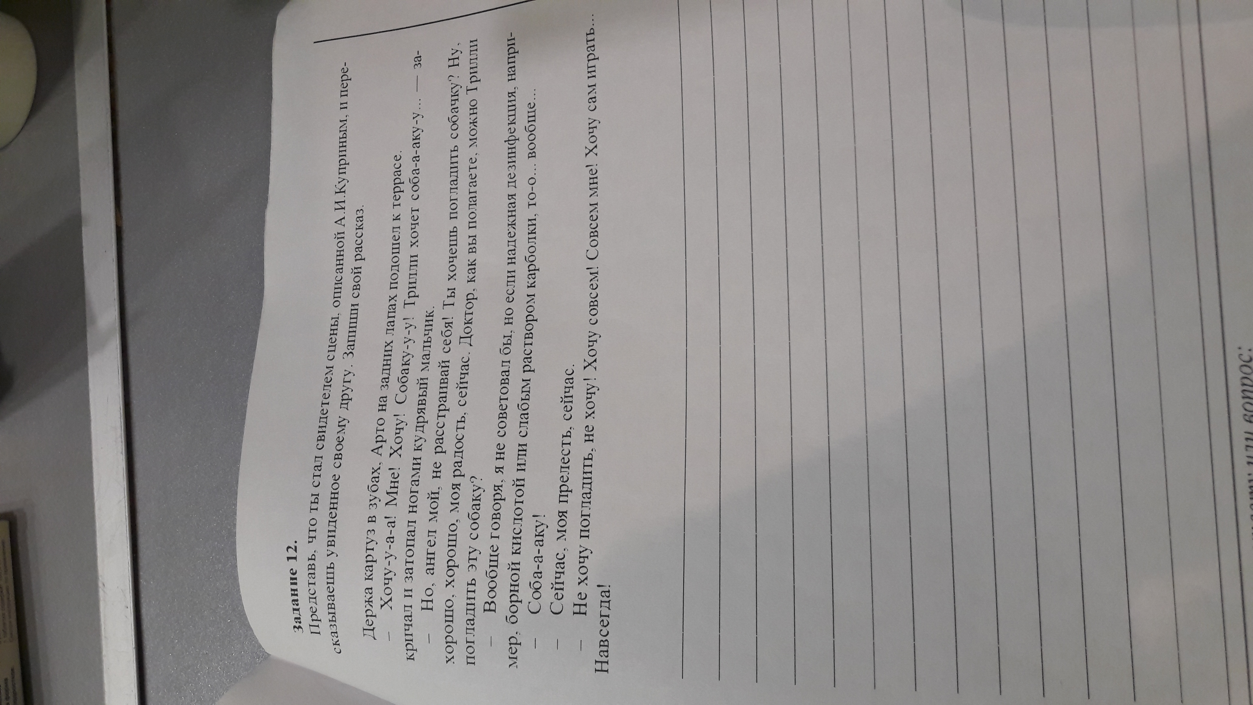 - Знаешь, сегодня в больнице (или где там у тебя) я видел мальчика, он визжал, плакал и собаку просил. Я стоял и смотрел как мама его успокаивает.Она предложила погладить собачку, доктор разрешил это сделать, только после надёжной дезинфекции, но тот мальчик не захотел гладить, он очень сильно хотел иметь своего щенка.