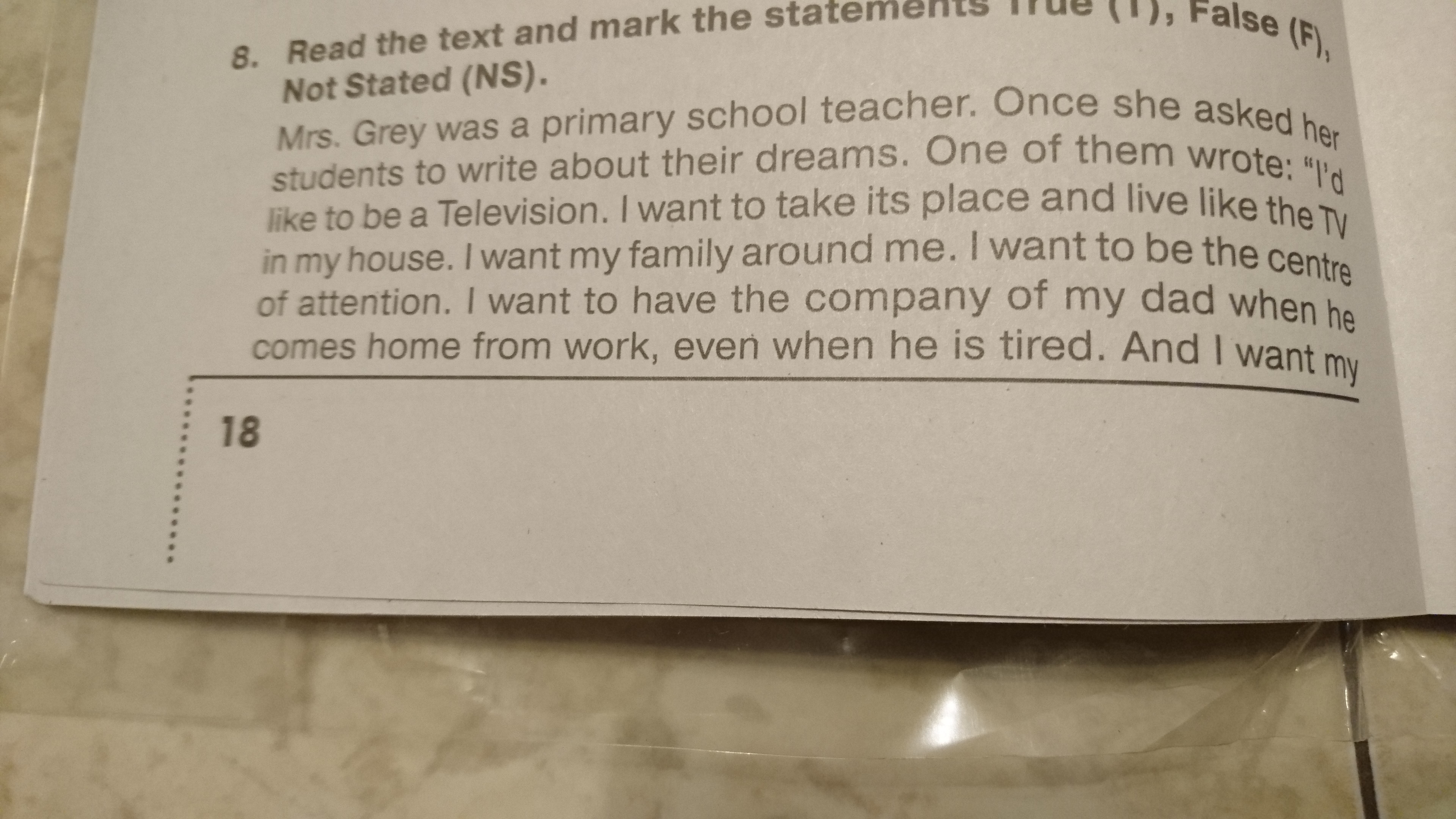 Миссис Грей была учительницей в начальной школе. Однажды она попросила своих учеников написать о своей мечте. Один из них написал: "Я хотел бы быть телевизором. Я бы хотел быть на его месте и быть в роли телевизора в своём доме. Я бы хотел, чтобы моя семья была рядом. Я хочу быть центром внимания. Я бы хотел быть в компании отца, когда он приходит с работы, даже если он уставший. И я хочу, чтобы мама тоже хотела проводить со мной время. Я могу сделать их всех счастливыми."