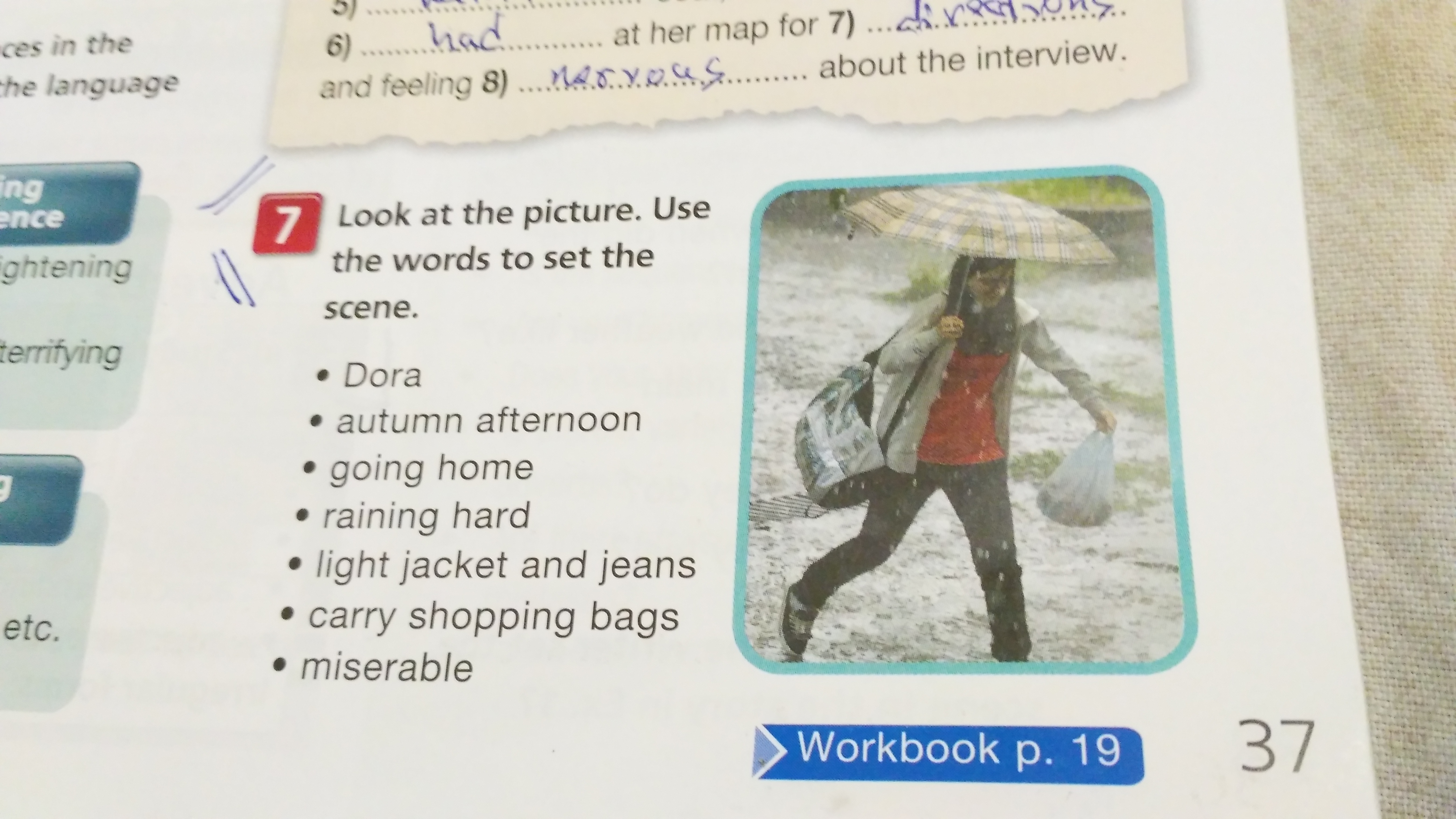 Нужно на английском описать происходящее на картинке (см. фото) используя все слова дынные левее.