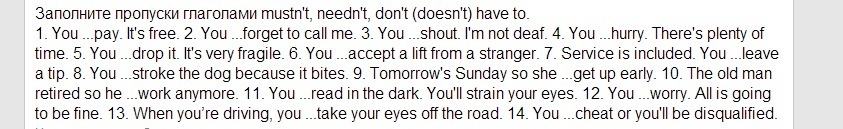 12. You needn't worry. All is going to be fine. 13. When you're driving, you mustn't take your eyes off the road.