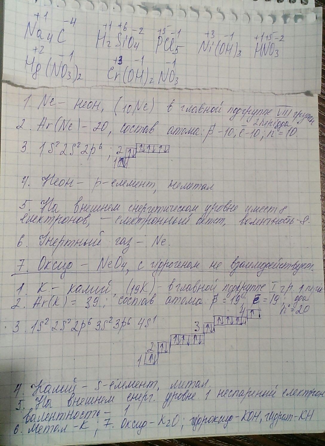 1. Калий - металлический химический элемент, который относится к щелочным металлам, т.к при взаимодействии с водой образует щелочь с выделением водорода. Калий стоит в 4 большой периоде, первой группе главной подгруппе. Заряд ядра атома +19, протонов 19, электронов 19, нейтронов 20. Относительная атомная масса 39. Протонное число 19, нуклонное число 39. Атом имеет 4 энергетических уровня, на которых соответственно идет распределение электронов: 2, 8, 8,1. На последнем энергетическом уровне 1 электрон - валентный. Поэтому формула атома 4s¹. Атом имеет 1 неспаренный электрон, поэтому валентность имеет 1. Калий имеет радиус атома больше, чем неон, значит атому легче отдавать электроны, чем их принимать. Электроотрицательность ниже. Высшй оксид К20.