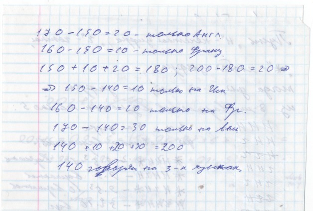 Из 200 студентов факультета иностранных языков 170 говорят на английском языке, 160 - на французском, 150 - на испанском. Каждый из студентов знает хотя бы один из этих языков, но никто не говорит на двух языках. Сколько студентов говорят на 3 языках?