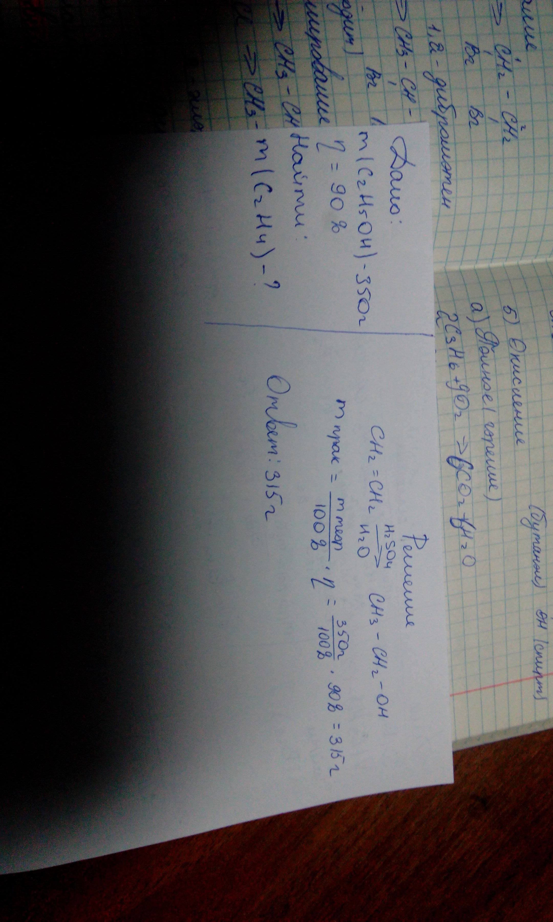 Вычислите массу этилена, необходимого для получения этилового спирта массой 350 грамм. Массовая доля выхода спирта составляет 90% от теоретически возможного.