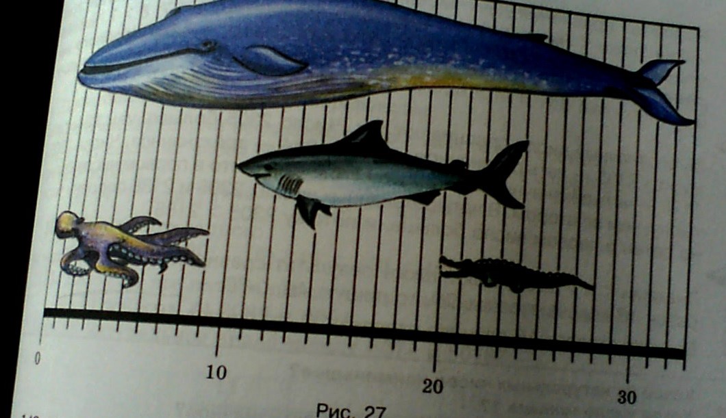 Найди длину каждого животного по рисунку.На сколько метров кит длиннее акулы.На сколько метров крокодил короче осьминога.
