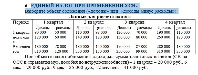 далее теперь расчитаем сумму налога "доходы" у нас сумма дохода 1020000-(20000+29000+35000+41000)=895000 рублей какая здесь % ставка налога если 1% то сумма налога 895000*1%=8950 рублей сравниваем суммы налогов 31950 и 8950 меньше 8950 значит выберем "доходы" ты точно должна знать какие процентные ставки налогов я тебе как пример записал 5% и 1%.