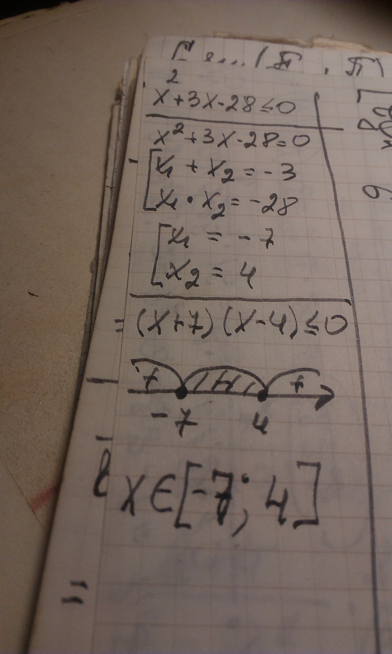 Розв'яжіть квадратну нерівність х2+3х-28≤0