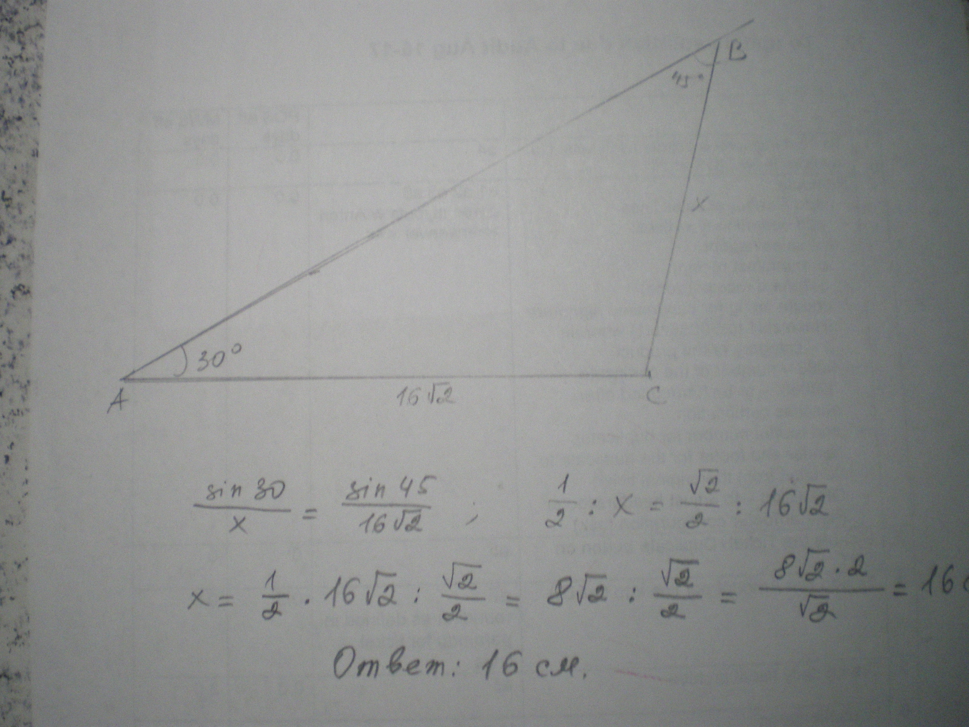 Известно , что в треугольнике АВС угол А равен 30 градусов, угол В равен 45 градусов. Найдите длину стороны ВС , если длина стороны АС равна 16√2 см.