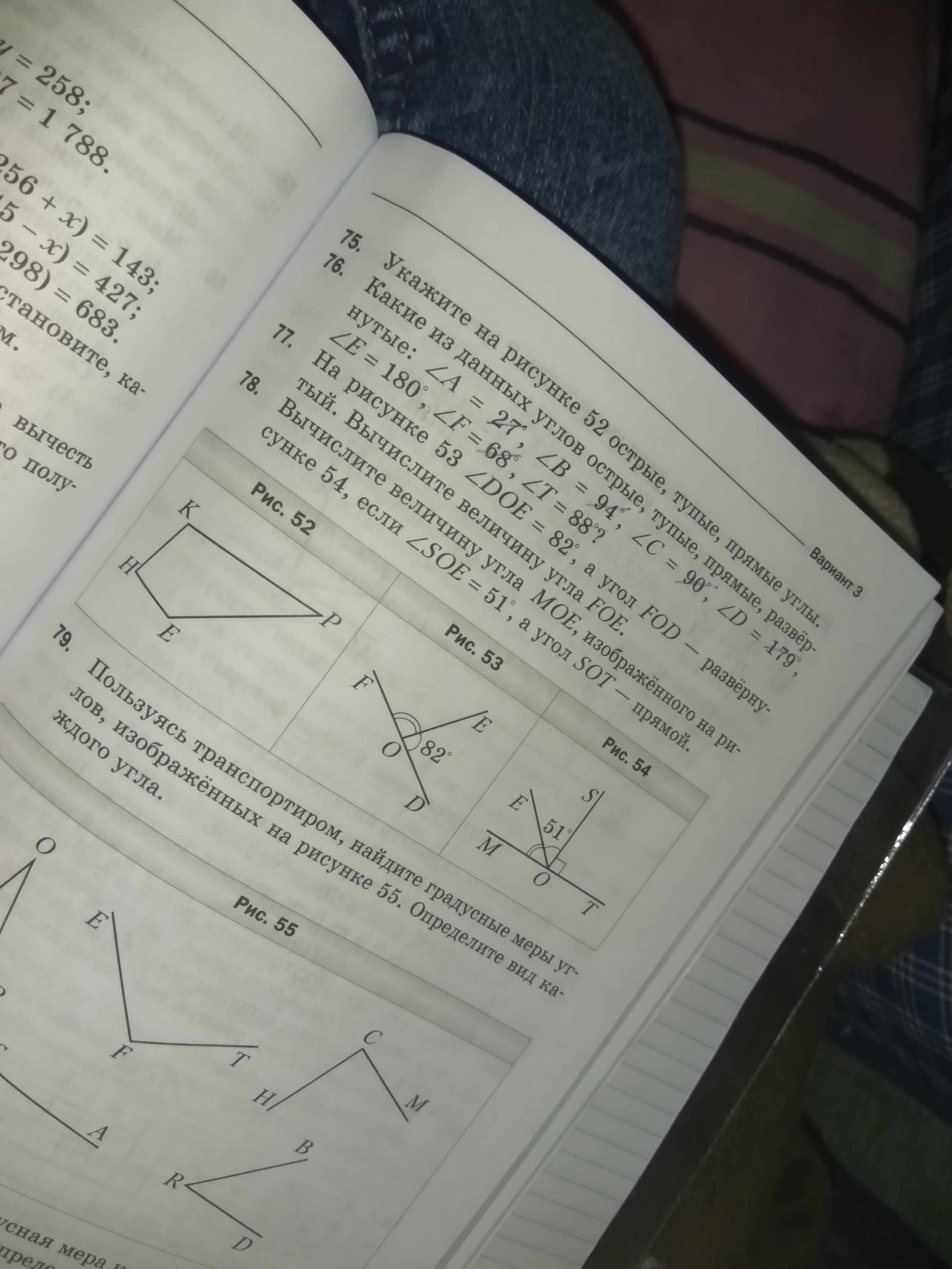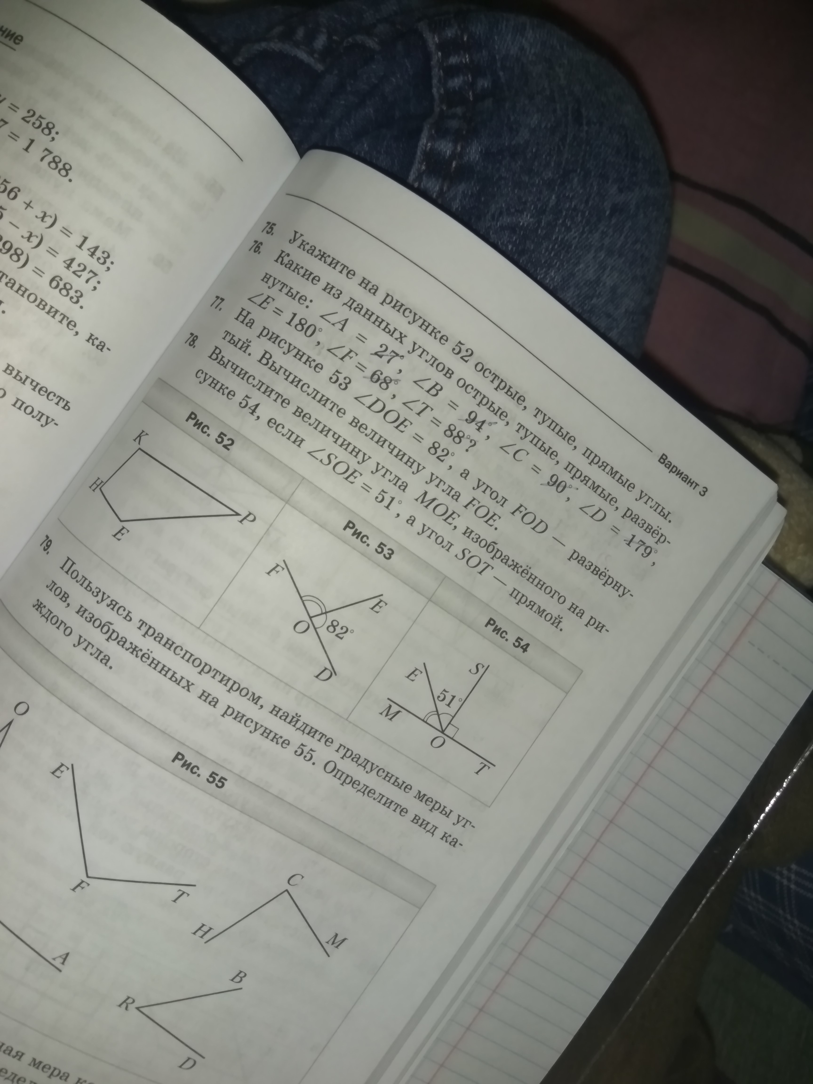 Вычислите величину угла MOE,изображённого на рисунке 54,если угол SOE=51°,а угол SOT -прямой