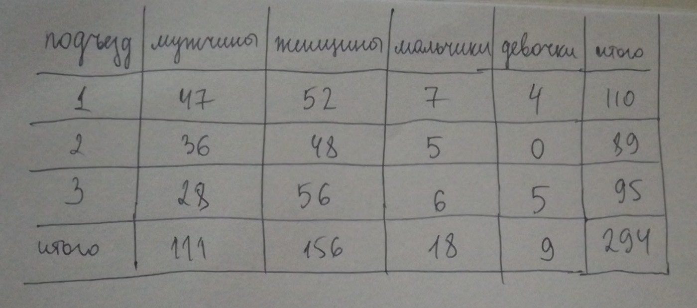 часть 1 Учебник страница 78 задание 39 Витя собрал сведения о жителях своего дома он выяснил что в первом подъезде живут 47 мужчин 52 женщин 7 мальчиков и 4 девочки во втором подъезде живут 36 мужчин 48 женщин и 5 мальчиков а в третьем подъезде живут 28 мужчин 56 женщин 6 мальчиков и 5 девочек Заполни таблицу данными которые собрал Витя