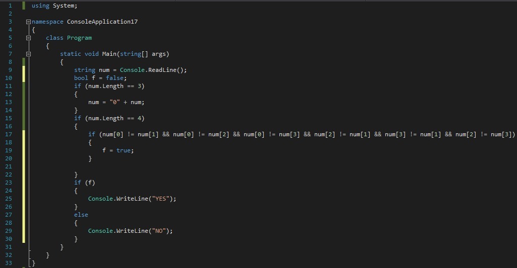 Дано натуральное число n (n < 9999). Выяснить, различны ли все четыре цифры этого числа (с учетом четырех цифр). Например, в числе 3678 все цифры различны, в числе 0023 — нет.
