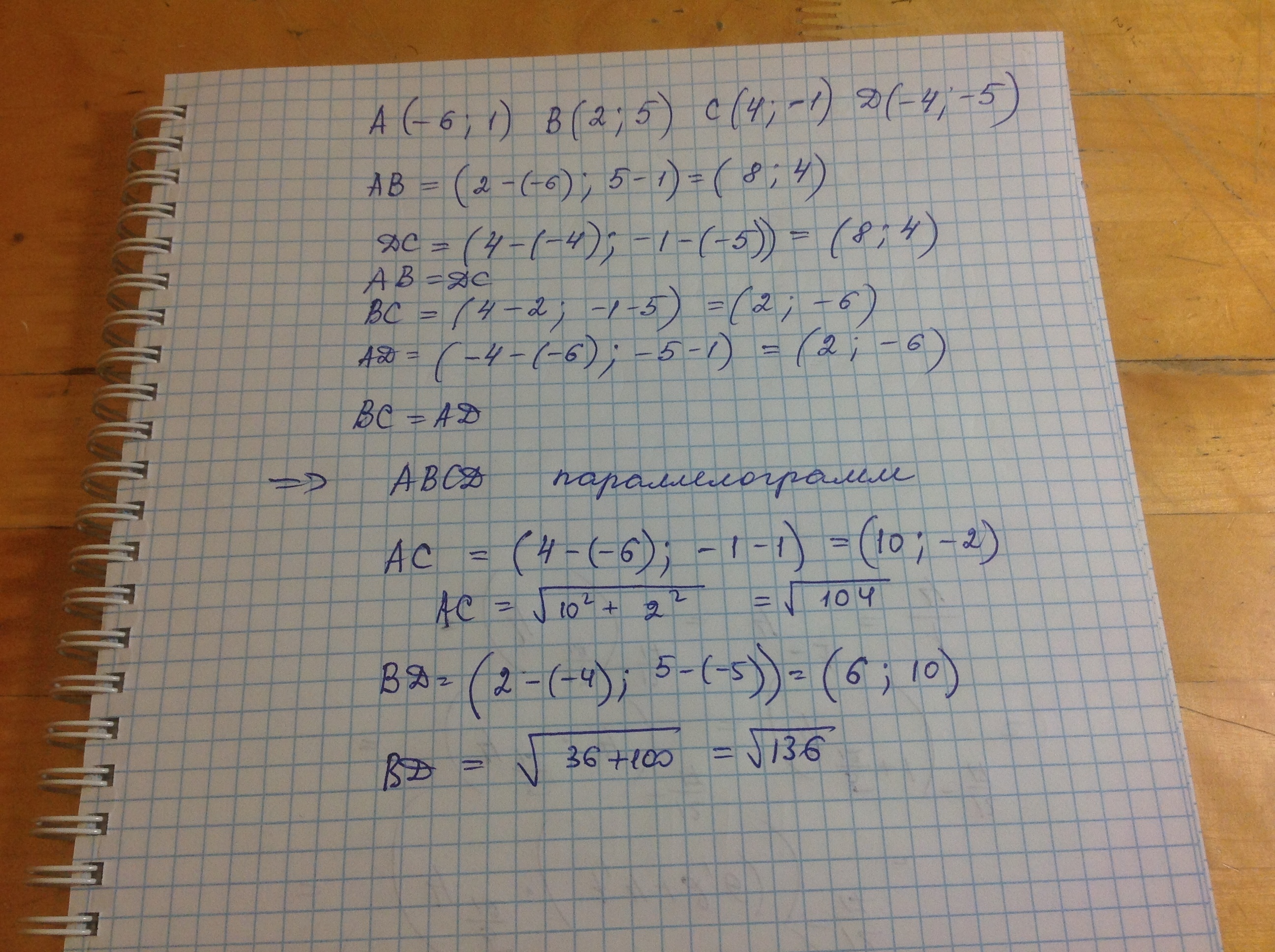 Четырехугольник имеет вершины с координатами А(-6;1), В(2;5), С(4;-1), D(-4;-5). Определите вид четырехугольника (с обоснованием) и найдите его диагонали.