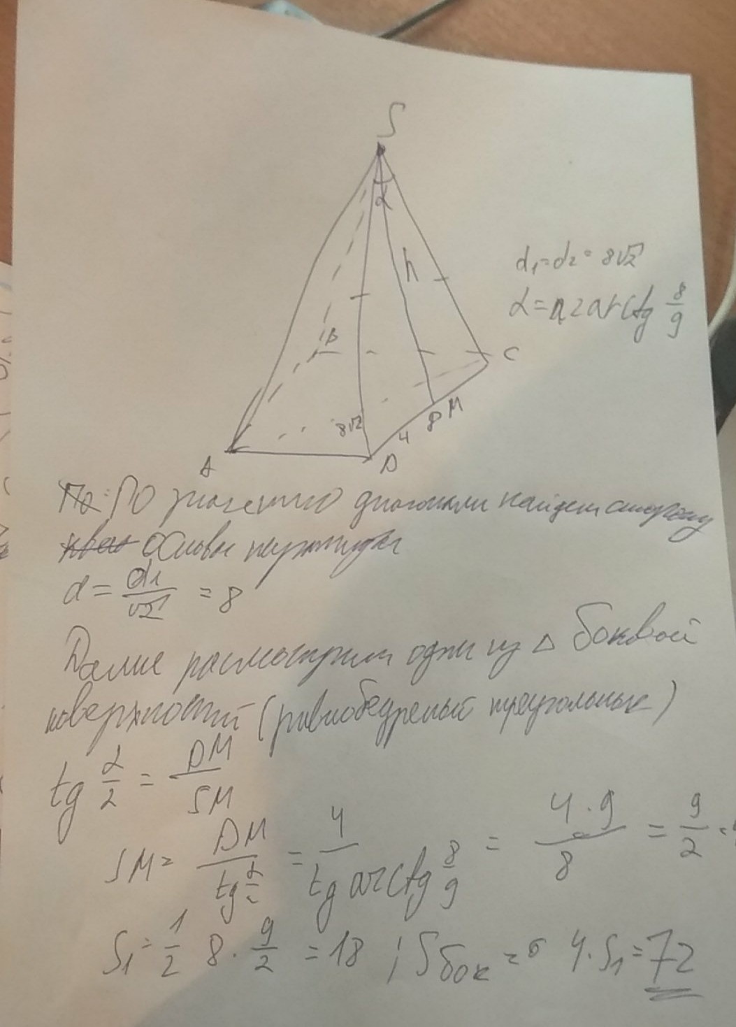 Найдите площадь боковой поверхности правильной четырёхугольной пирамиды, если длина диагонали её основания равна 8 корней из 2 и плоский угол при вершине равен 2 arctg 8/9.
