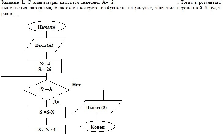 С клавиатуры вводится значение A= 2. Тогда в результате выполнения алгоритма, блок-схема которого изображена на рисунке, значение переменной S будет равно…