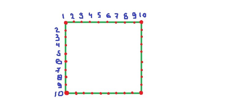Чтобы натянуть сетку вокруг участка, имеющего форму квадрата, вдоль каждой стороны надо поставить 10 столбиков. Сколько всего потребуется столбиков ?