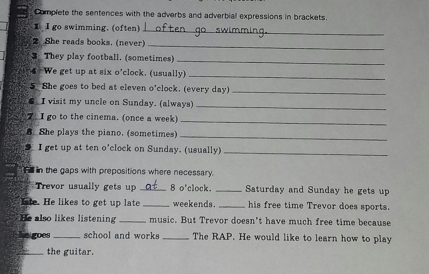 тебе надо просто писать первое слово например I They you she he и так далее потом подставить слово в скобках и дописать остальные слова например 2 she (never) reads book.Но скобки надо убрать.Поняла?????