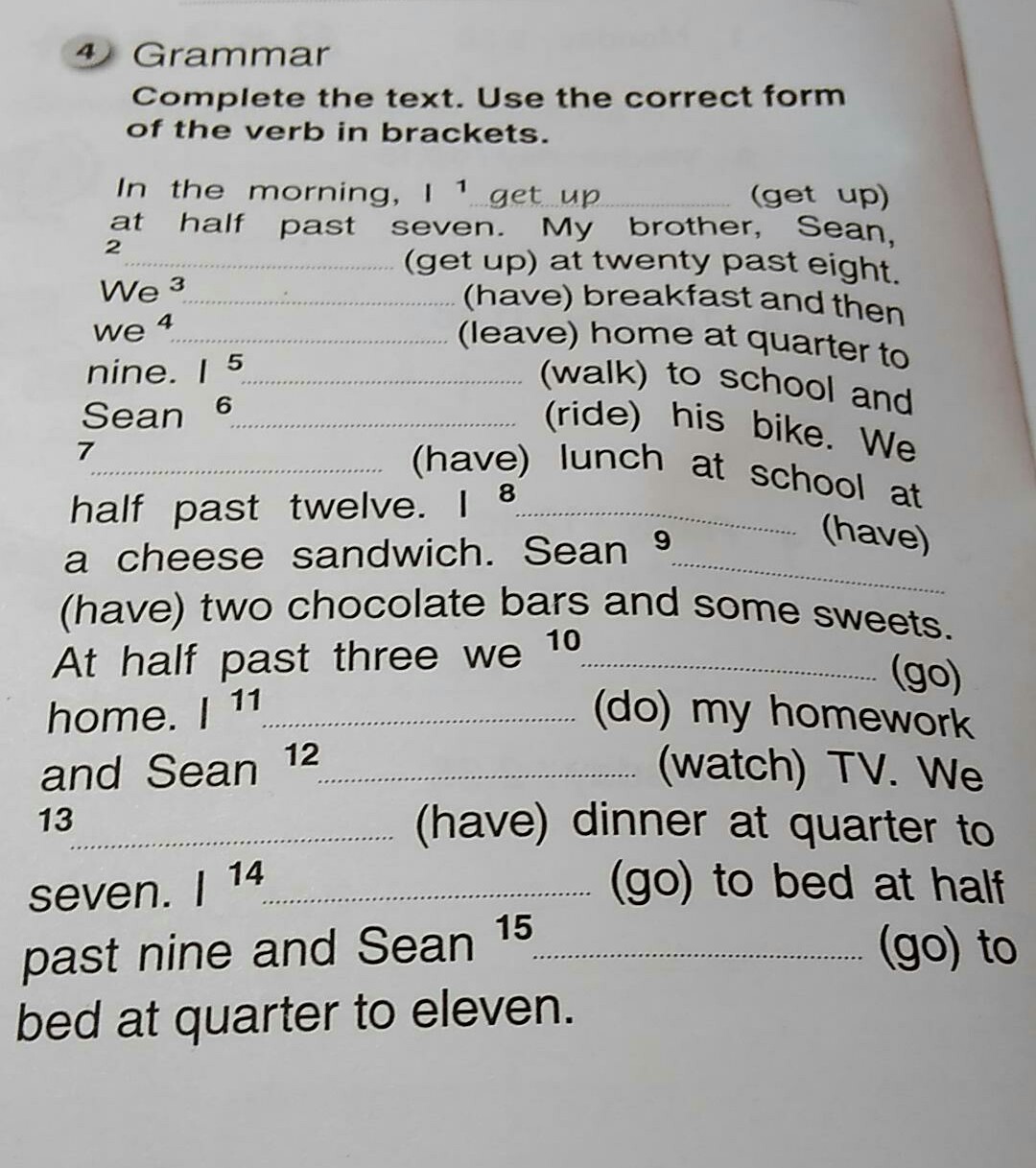 1)in the morning.I get up at half past seven. My brother, Sean, gets up at twenty past eight. We have breakfast and then we leave home at quarter to nine. I walk to school and Sean rides his bike. We have lunch at school at half past twelve. I have a cheese sandwich. Sean has two chocolate bars and some sweets. At half past three we goes home. I do my homework and Sean watches TV. We has dinner at quarter to seven. I go to bed at half past nine and Sean goes to bed at quarter to eleven