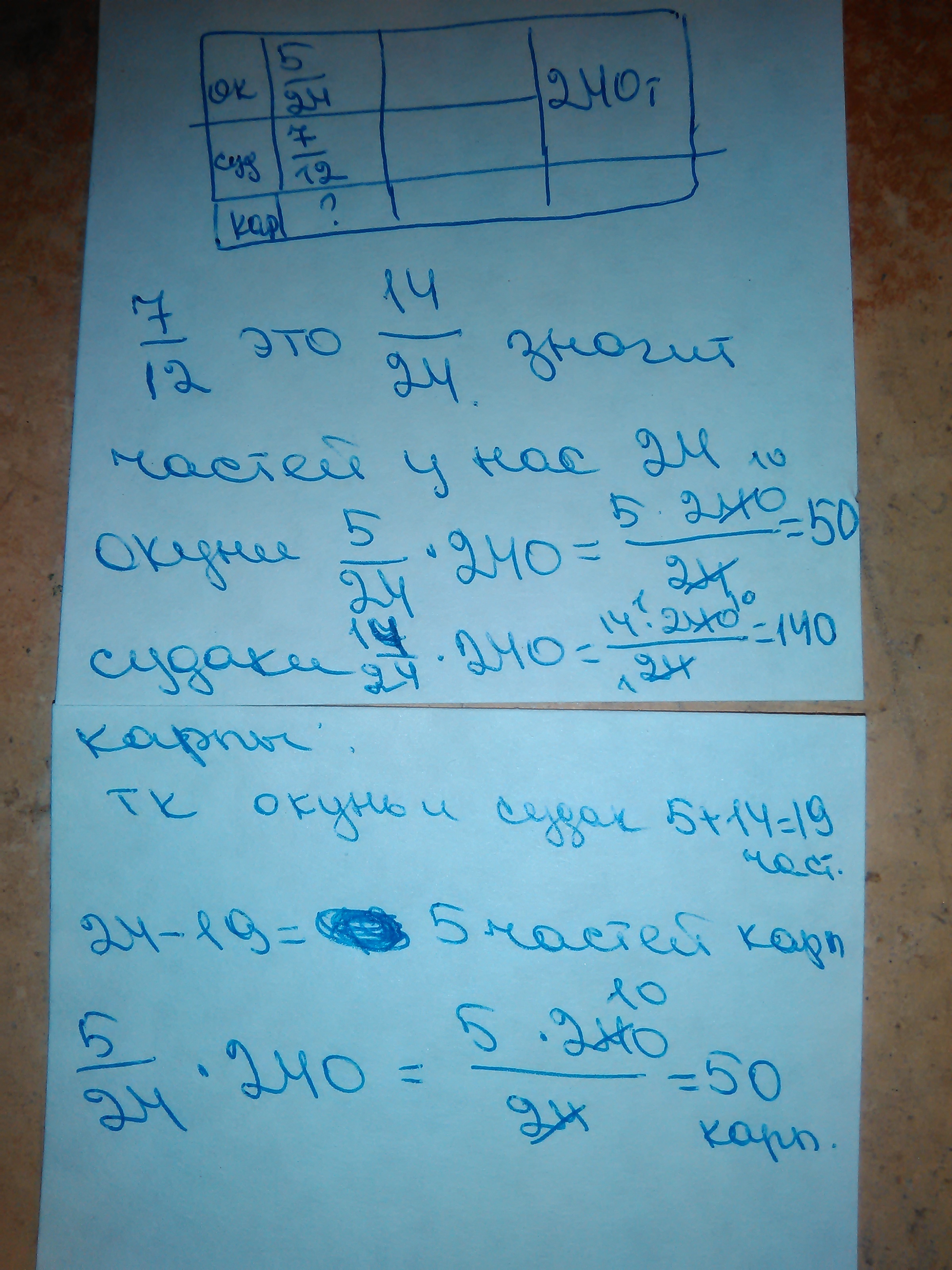 Рыбаки поймали 240 тонн рыбы. Окуни составили пять двадцать цетвёртых всей рыбы, судаки семь двенадцатых всей рыбы , а остальные были карпы. Сколько было карпов ? Что ещё можно узнать?