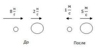 Какое отношение масс большого и маленького шара, если их скорости до и после столкновения указаны на рисунке?