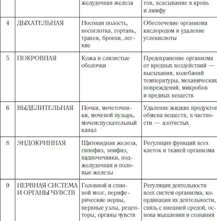 3. Пищеварительная| язык, зубы, слюнные железы, глотка, пищевод, желудок, кишечник, печень, поджелудочная железа| измельчение пищи, смачивание её слюной, переваривание при помощи пищеварительных ферментов, всасывание в кровь и лимфу