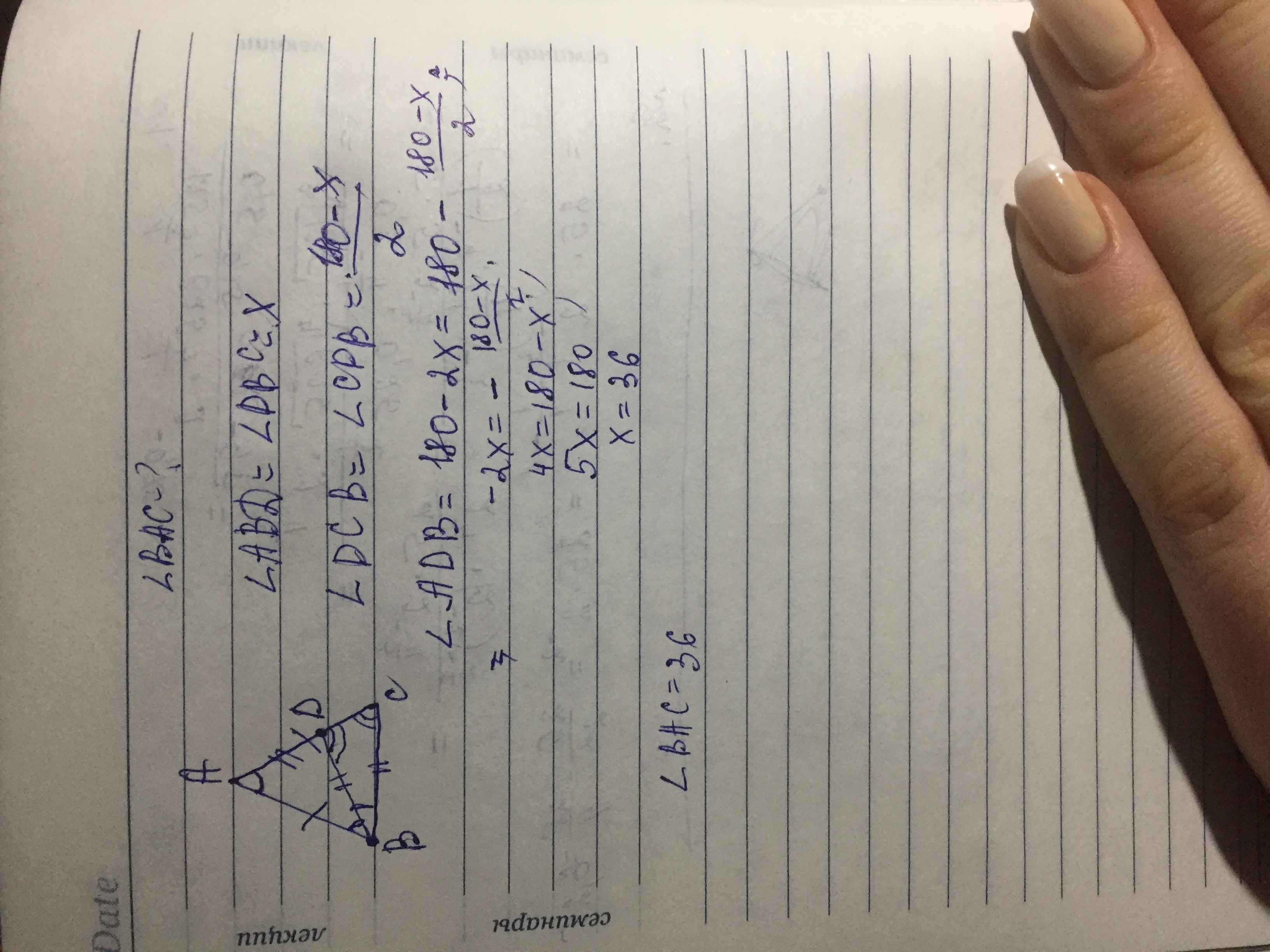 В равнобедренном треугольнике ABC с основанием BC провели биссектрису BD. Известно, что BC= BD= AD. Найдите угол BAC.