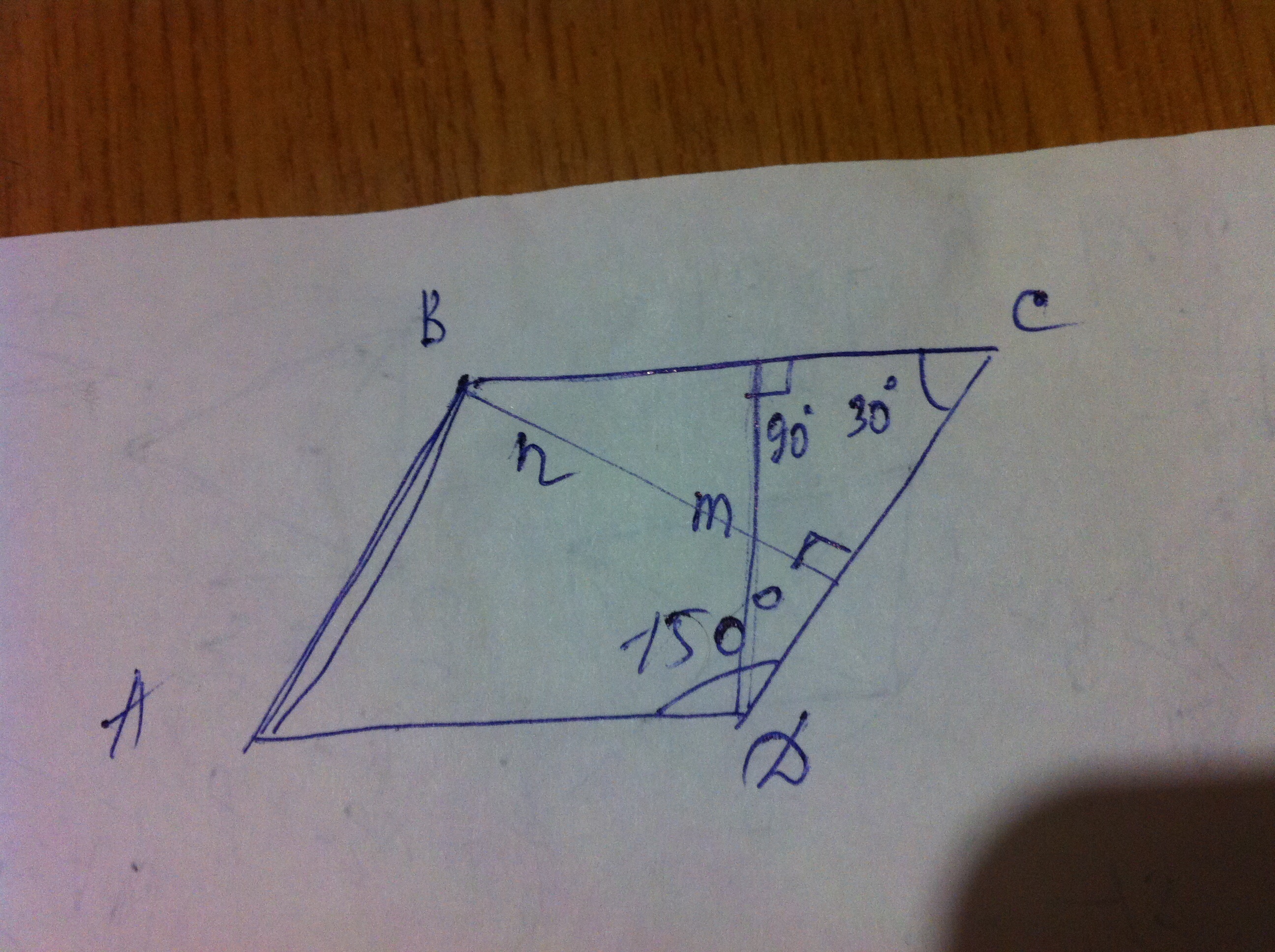 тупой угол параллелограмма равен 150 градусов. длина перпендикуляров,опущенных Из точки пересечения диагоналей к смежным сторонам, равен n и m.Найдите стороны параллелограмма.