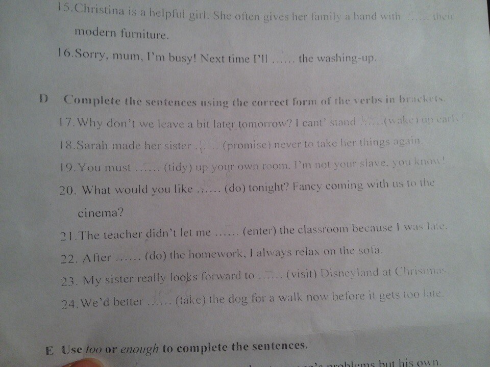 17 waking 18 promise 19 tidy 20 to do 21 enter 22 doing 23 visiting 24 take