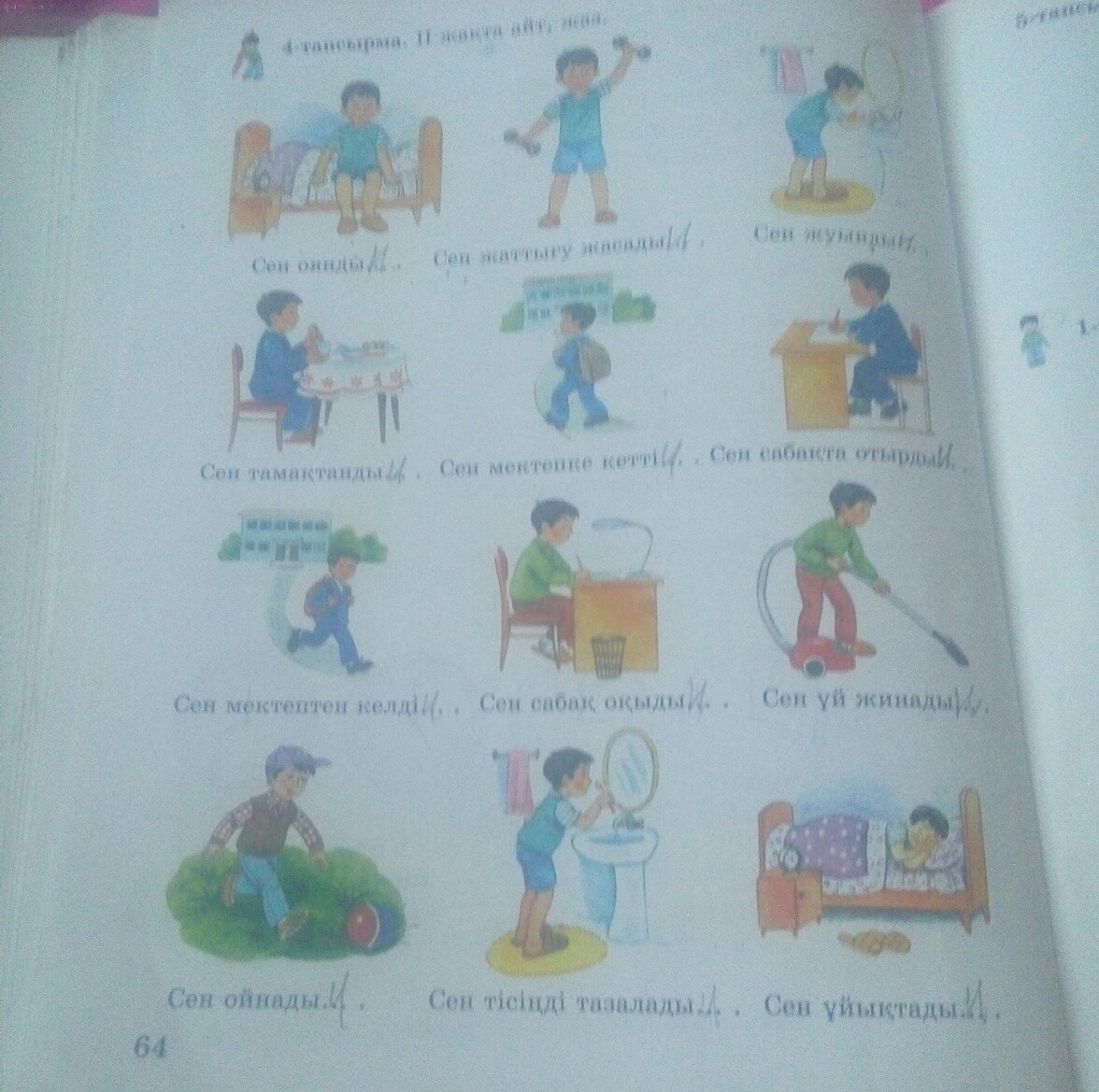 если да то Мен оянды, жаттыгу орындады, жуынды , тамактанды ,мектепке кетті , сабақта отырды , мектептен келді ,сабақ оқыды, уй жинайды, ойнайды , жуынды , уйықтайды.