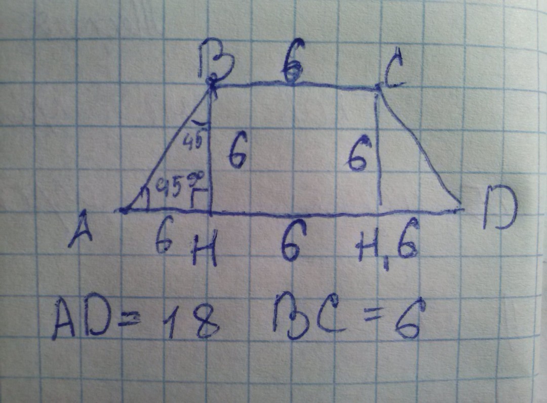 Пояснение,угол А=45 по условию высота образует угол в 90 градусов в треугольнике АBH. треугольник равнобедренный если углы у основания равны BH=AH CH1=HD HBCH1- квадрат со стороной 6. значит AD=6+6+6=18 BC=6