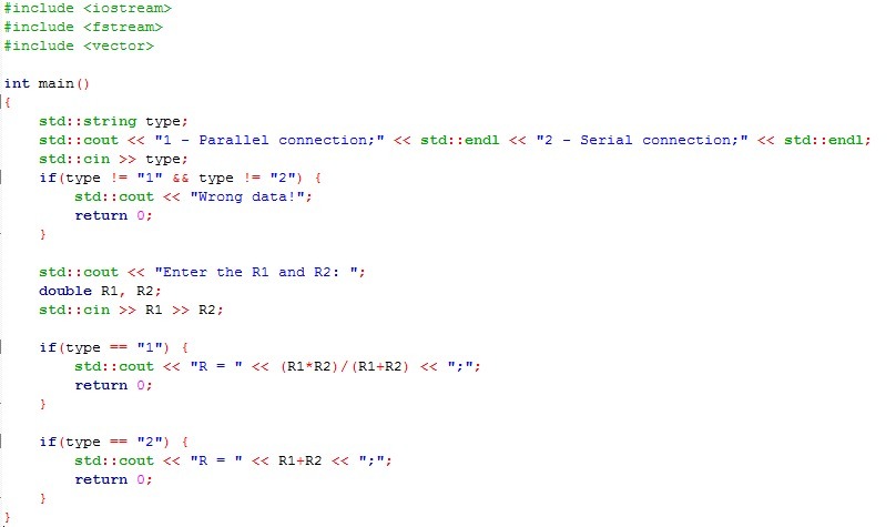 Найти сопротивление цепи из двух соединенных проводников. Сопротивления проводников и тип соединения запрашивать с клавиатуры. При последовательном соединении проводников R=R1+R2, при параллельном соединении проводников R=R1*R2/(R1+R2)