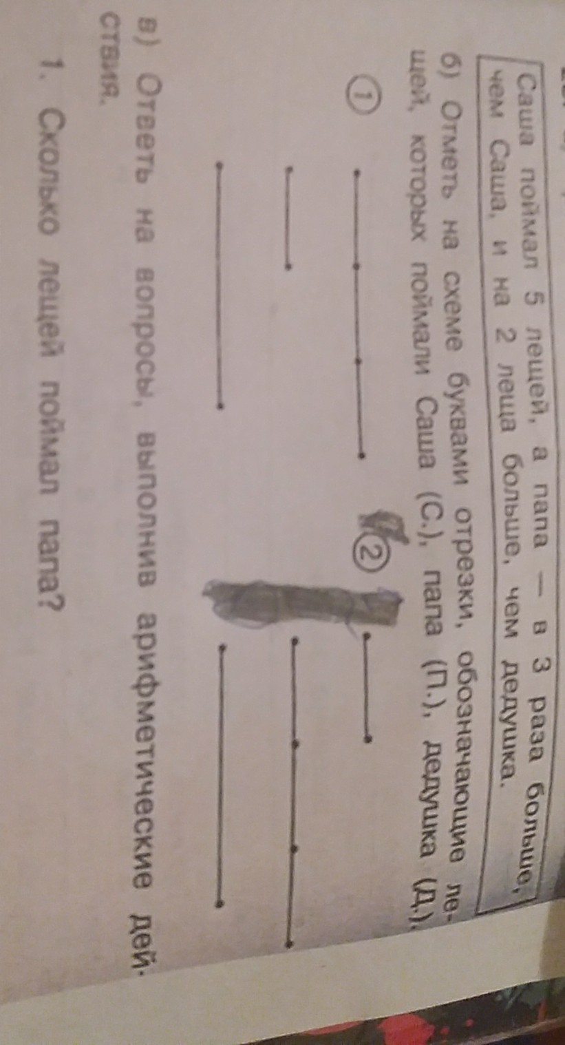 Саша поймал 5 лещей а папа в 3 раза больше чем Саша и на 2 лещей больше чем дедушка.Какая схема правильная заранее Спасибо