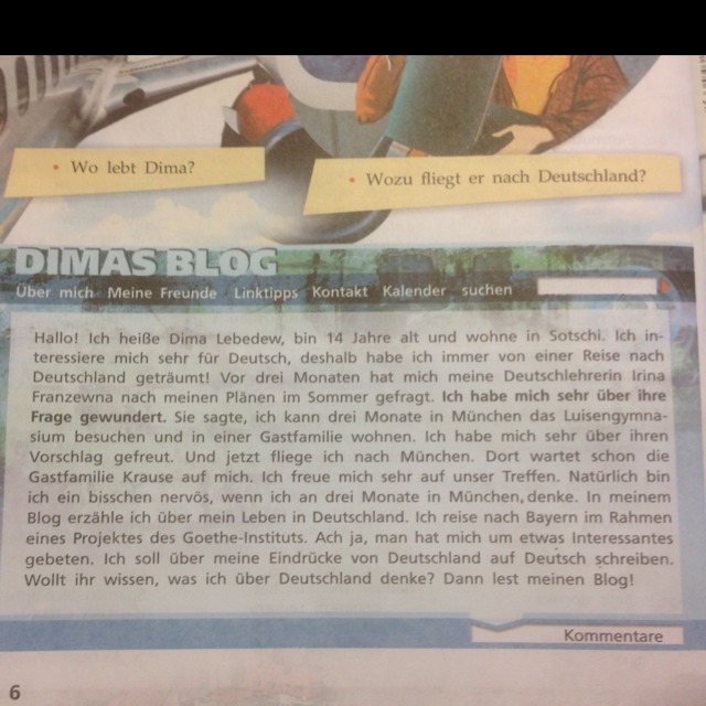 привет! Меня зовут Дима Лебедев, мне 14 лет и я живу в Сочи. Я очень интересуюсь немецким языком, в связи с этим (поэтому), я всегда мечтал о поездке в Германию. 3 месяца назад моя учительница Ирина Францевна спросила меня о планах на лето. Я очень удивился ее вопросу. она сказала, что я могу пробыть три месяца в Мюнхене, в Луизен-гимназии (либо гимназии Св.Луизы) и пожить в принимающей (учеников) семье. Я очень обрадовался ее предложению. Теперь я лечу в Мюнхен. Там меня уже ждет (принимающая) семья Краузе. Я очень радуюсь нашей встрече. Конечно, я немного переживаю, когда думаю о трех месяцах в Мюнхене.В своем блоге я рассказываю о своей жизни в Германии. Я еду в Баварию в рамках проекта Гёте-Института. Ах да, меня попросили об одном интересном деле. Я должен написать о моих впечатлениях о Германии на немецком языке. Хотите узнать, что я думаю о Германии? Тогда читайте мой блог!